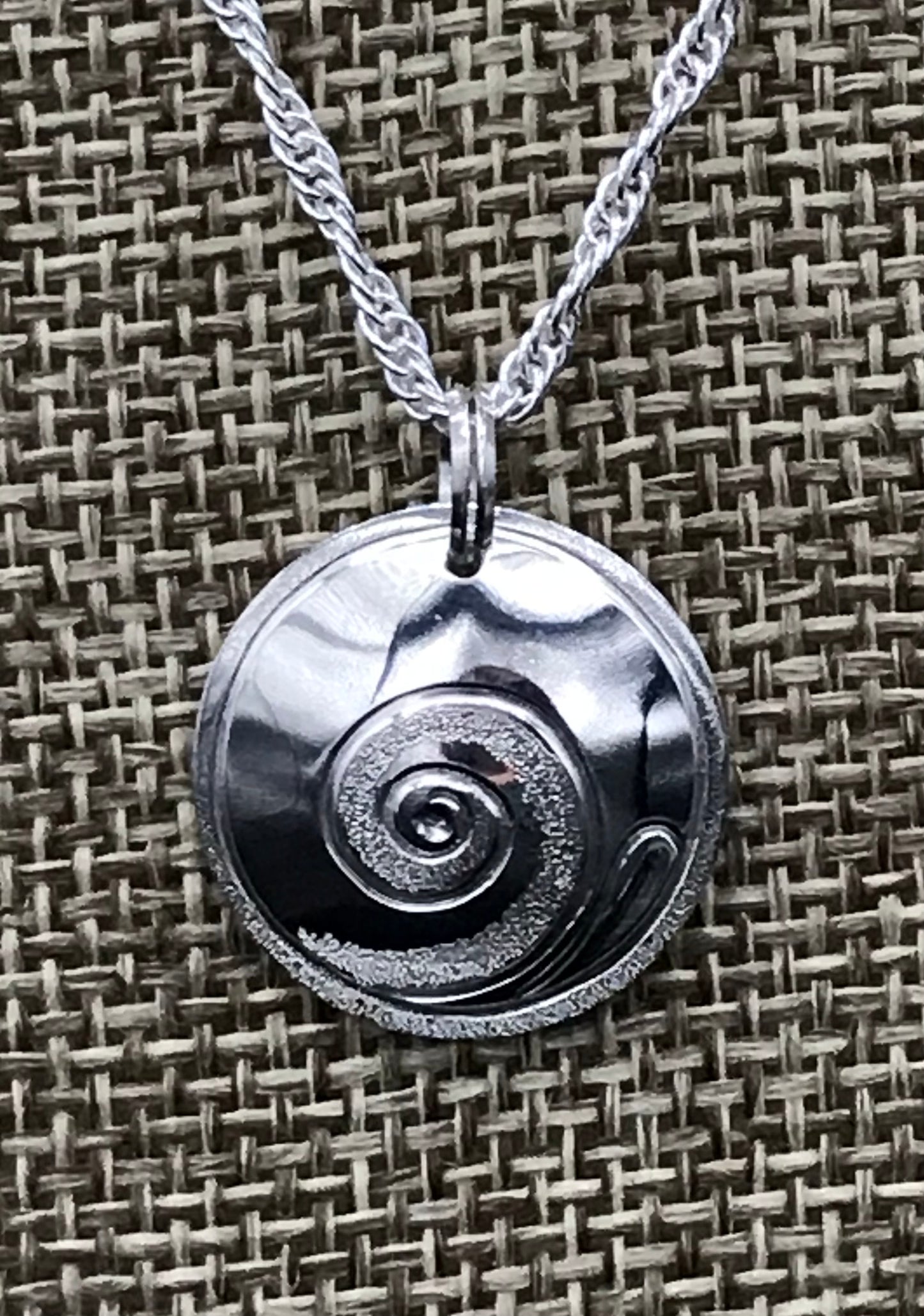 This Moon Snail sterling silver round pendant is 3/4 inch round made from .8mil thickness silver and comes on a 18 inch sterling silver rope chain ready to wear. This pendant is slightly domed with a textured border and inner swirl.